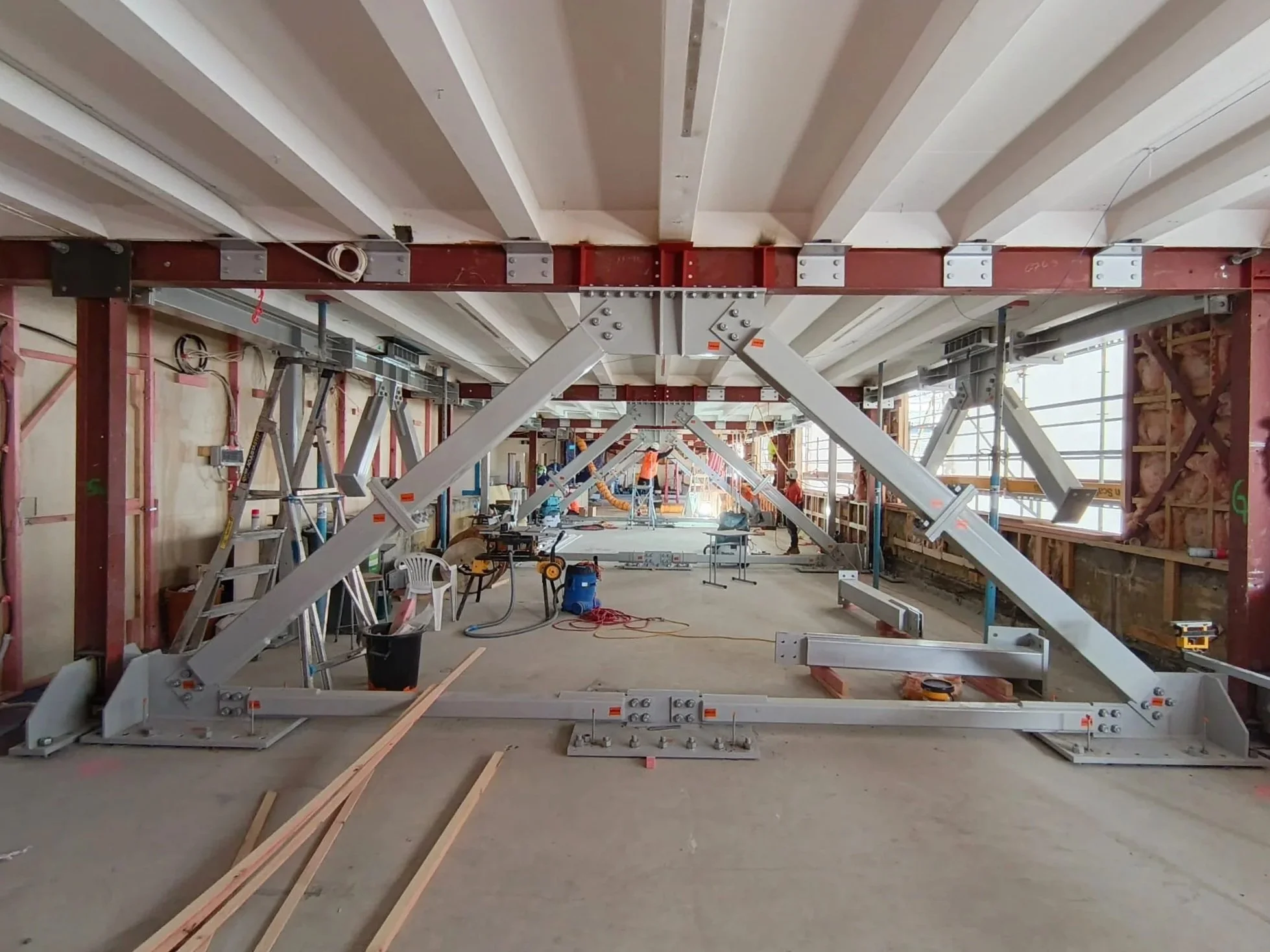 A key focus of the strengthening programme was the top two floors, which were added in the 1990s above the original 1940s structure. Integrating newer construction with the existing building fabric required structural intervention to improve seismic performance. This ensured its continued use as an active learning space as part of the broader redevelopment of the campus.